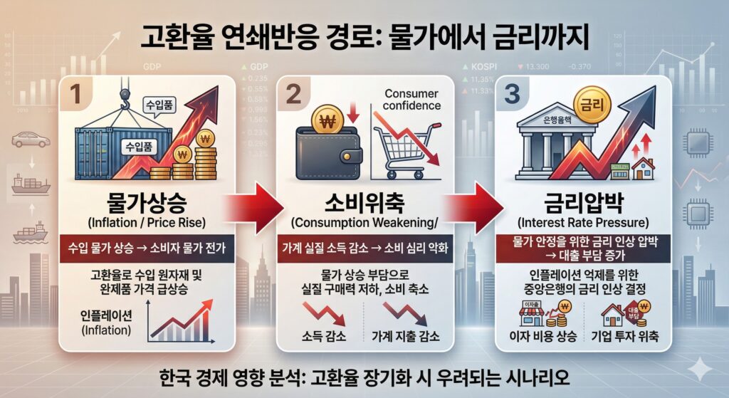 위 이미지에서 보시듯, 고환율은 단순히 환전의 문제가 아니라 ‘물가 상승 → 소비 위축 → 금리 압박’으로 이어지는 악순환의 출발점입니다.
