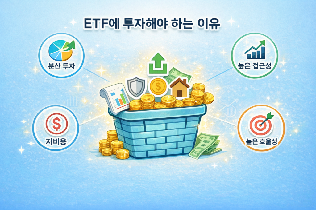 ETF(상장지수펀드)는 특정 지수나 자산의 움직임을 따라가도록 설계된 펀드로, 주식처럼 거래소에서 실시간 매매가 가능합니다. 한 종목만 매수해도 여러 종목에 분산투자하는 효과를 얻을 수 있으며, 수수료 비용이 낮고 운용이 투명한 투자 상품입니다.